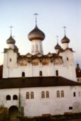 Вид Преображенского собора Соловецкого Кремля с маковки Надвратной монастырской церкви в белую ночь.
