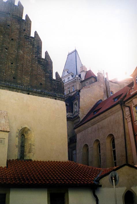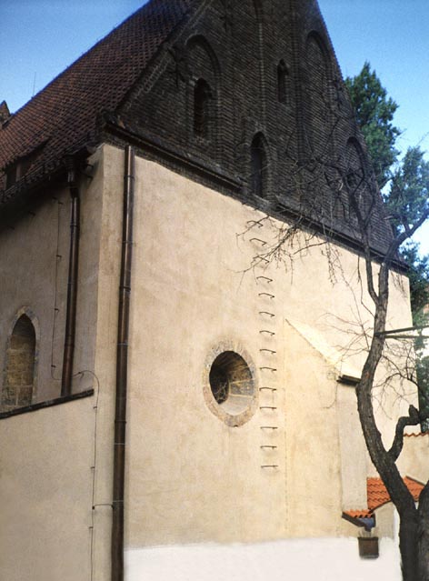 Здесь, в еврейском квартале, находится самая древняя сохранившаяся синагога в центральной Европе. Она была построена в XIII веке, и являет собой яркий пример строгости и аскетичности раннеготического стиля в архитектуре. Это простая, вытянутая постройка с высокой двускатной крышей, с трех сторон окруженная пристройками женских нефов. Интерьер представляет собой двухнефный объем, перекрытый шестью парусами нервюрных сводов, опирающихся на два мощных столба. Здесь сохранилось первоначальное, по окружности стен, расположение сидений, обращенных к центру, где находится возвышение с пюпитром для чтения торы. Это возвышение отделено декоративной позднеготической решеткой.